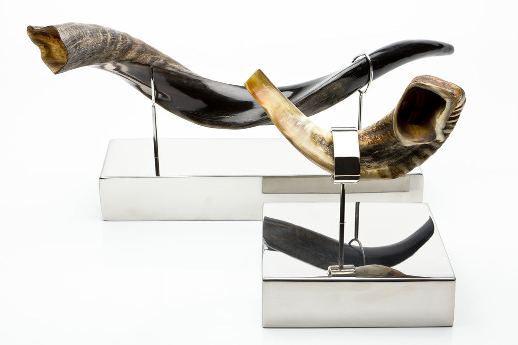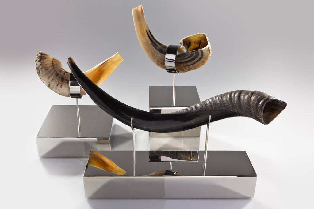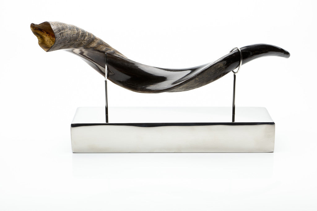 Yemenite Jewish ritual horn (shofar) on mirror polished stainless steel base handmade by local artisans.